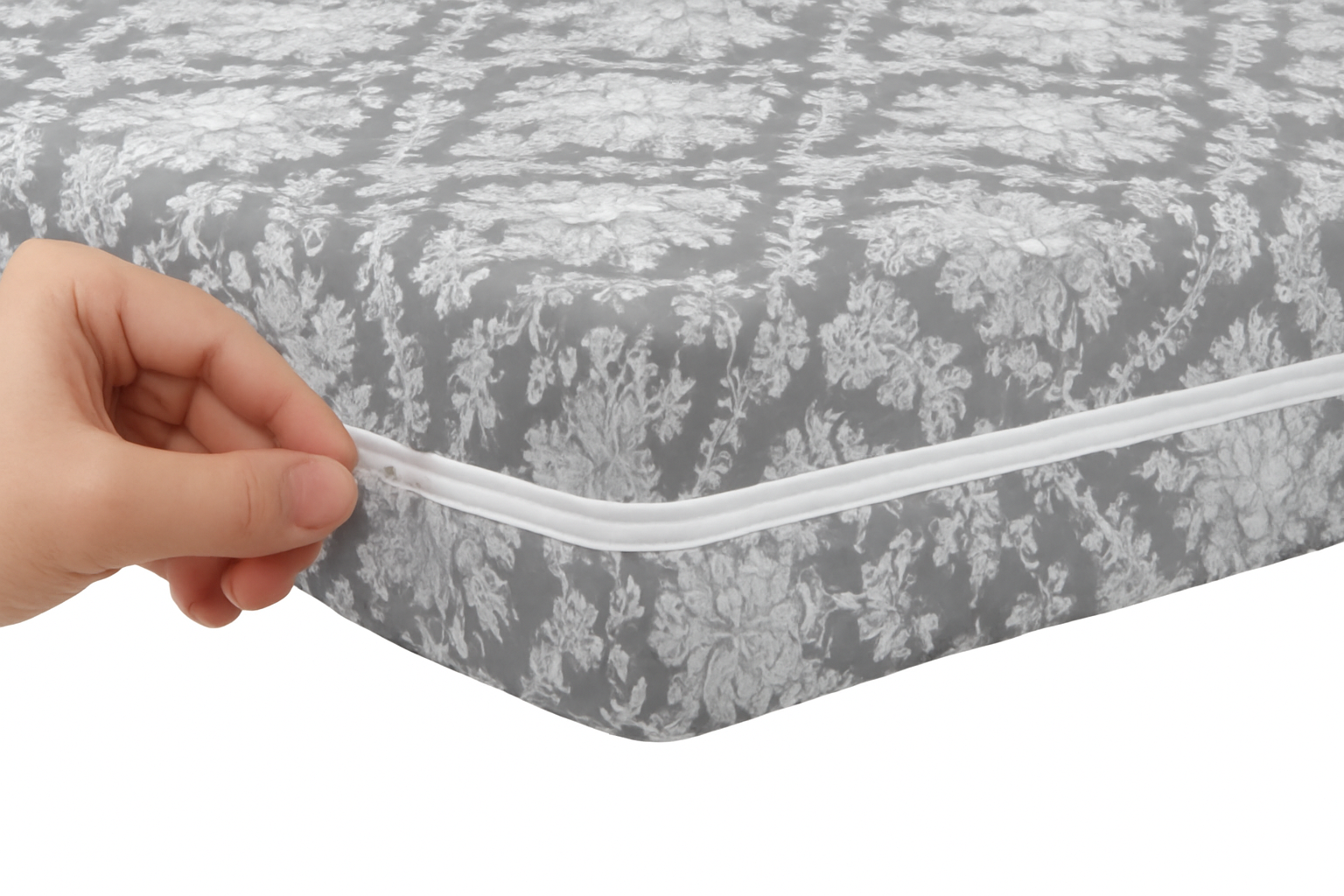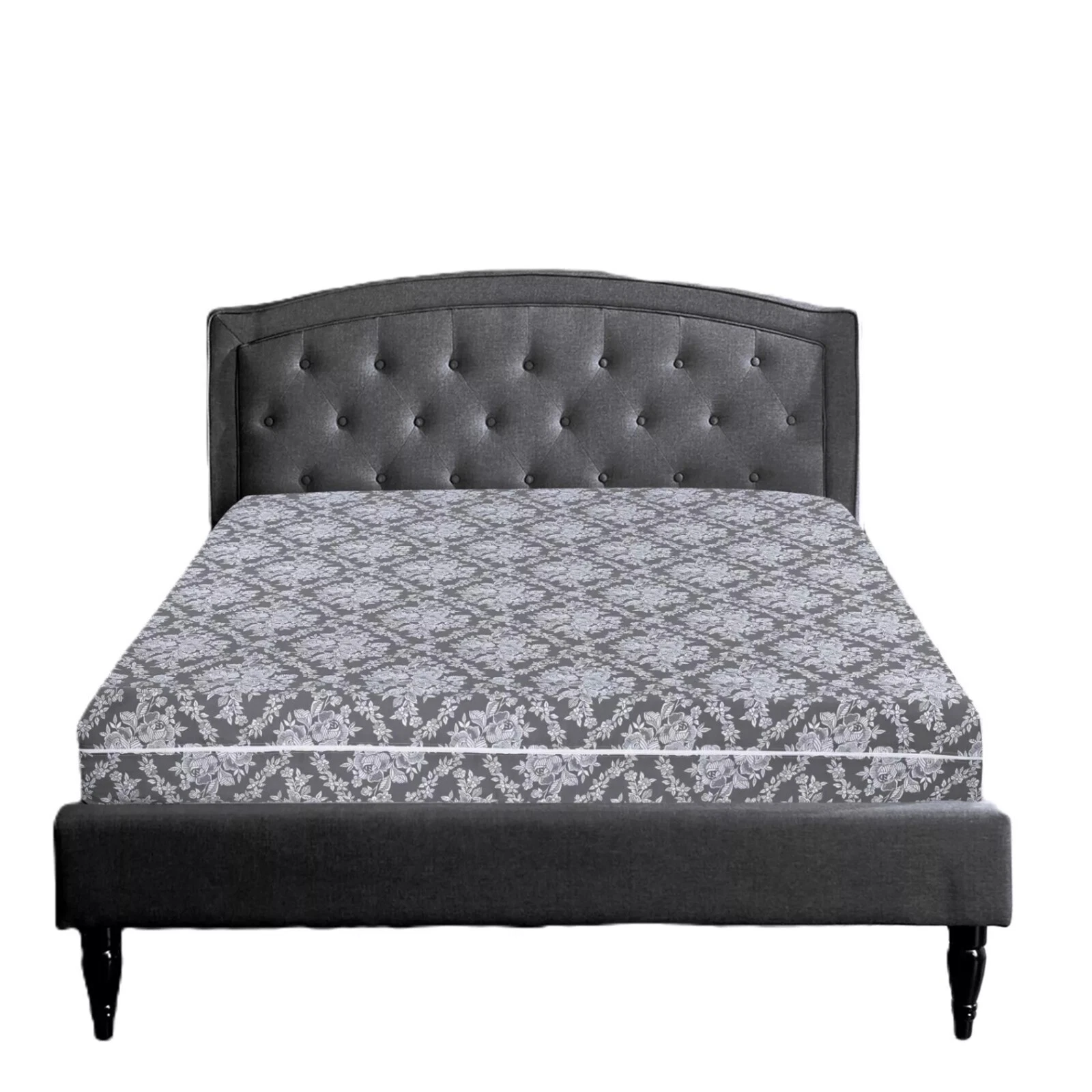Featuring a timeless floral pattern in a deep dark grey, this protector adds a decorative flair while maintaining practicality and hygiene.